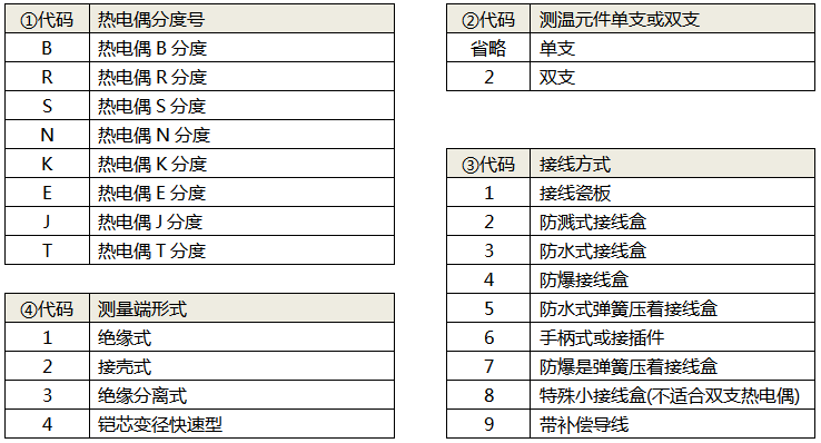 熱套式熱電偶型號中的代碼說明: